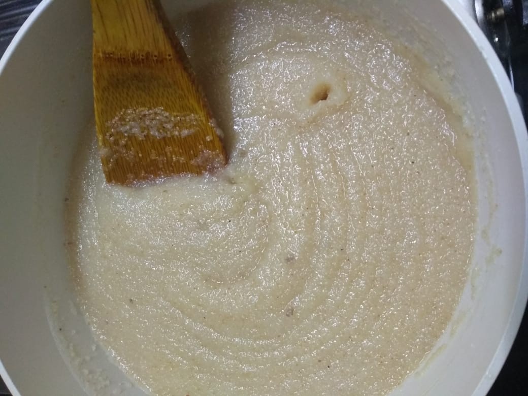When slightly cooked then do as I have done in the picture below because of this the heat is not direct and there is no chance of halwa sticking at the bottom.